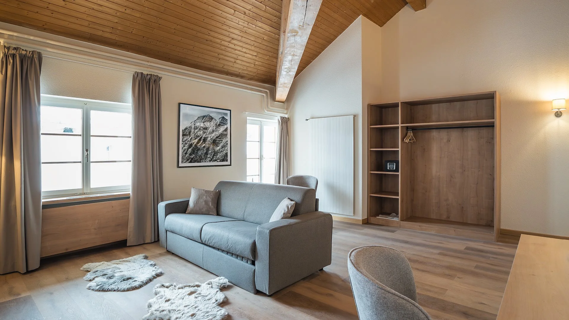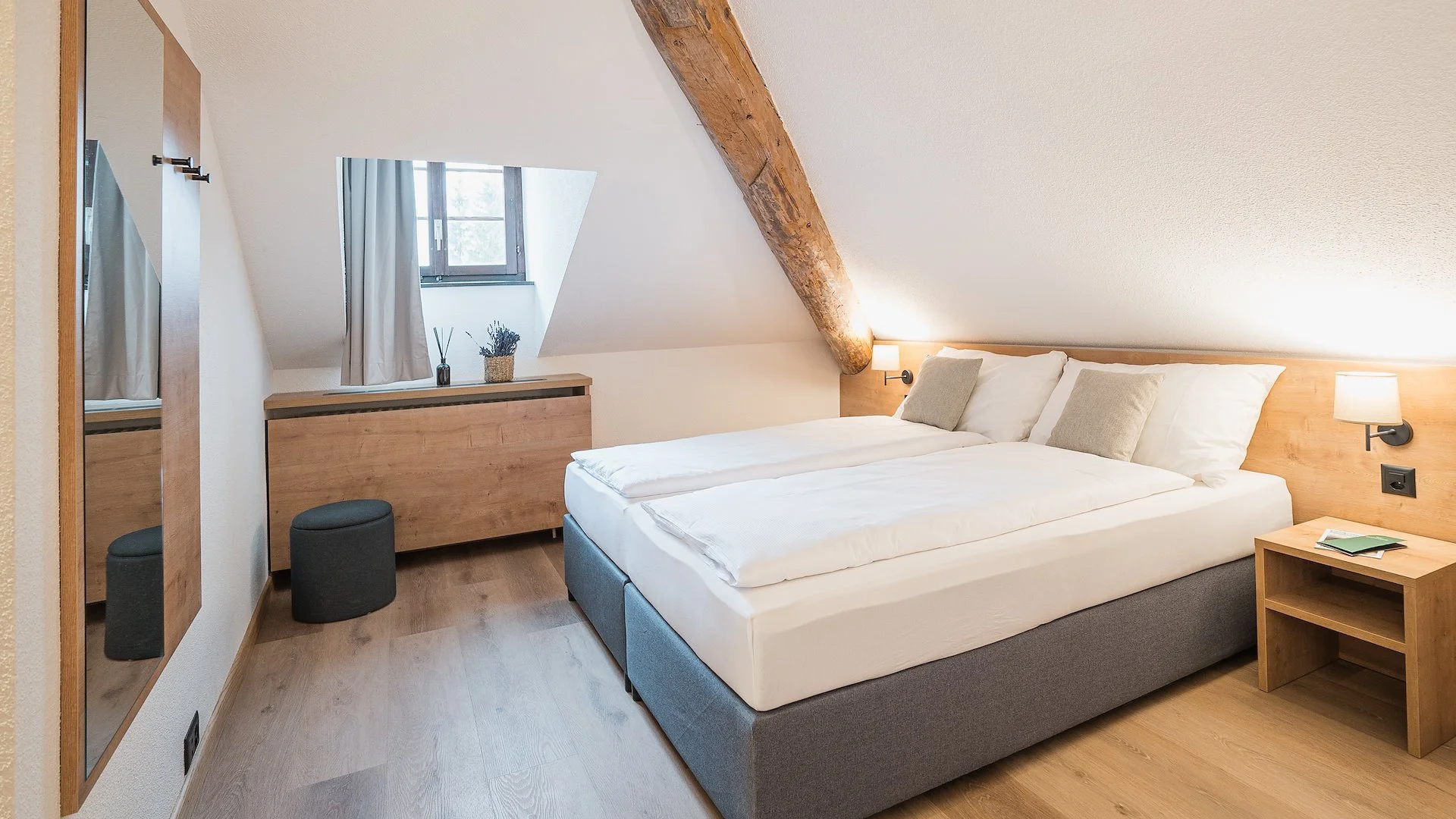 Camera doppia mansardata dotata di letto alla francese. Arredata con materiali naturali e colori caldi. Ottima per soggiorni di breve durata. Non è possibile aggiungere culle per bambini.